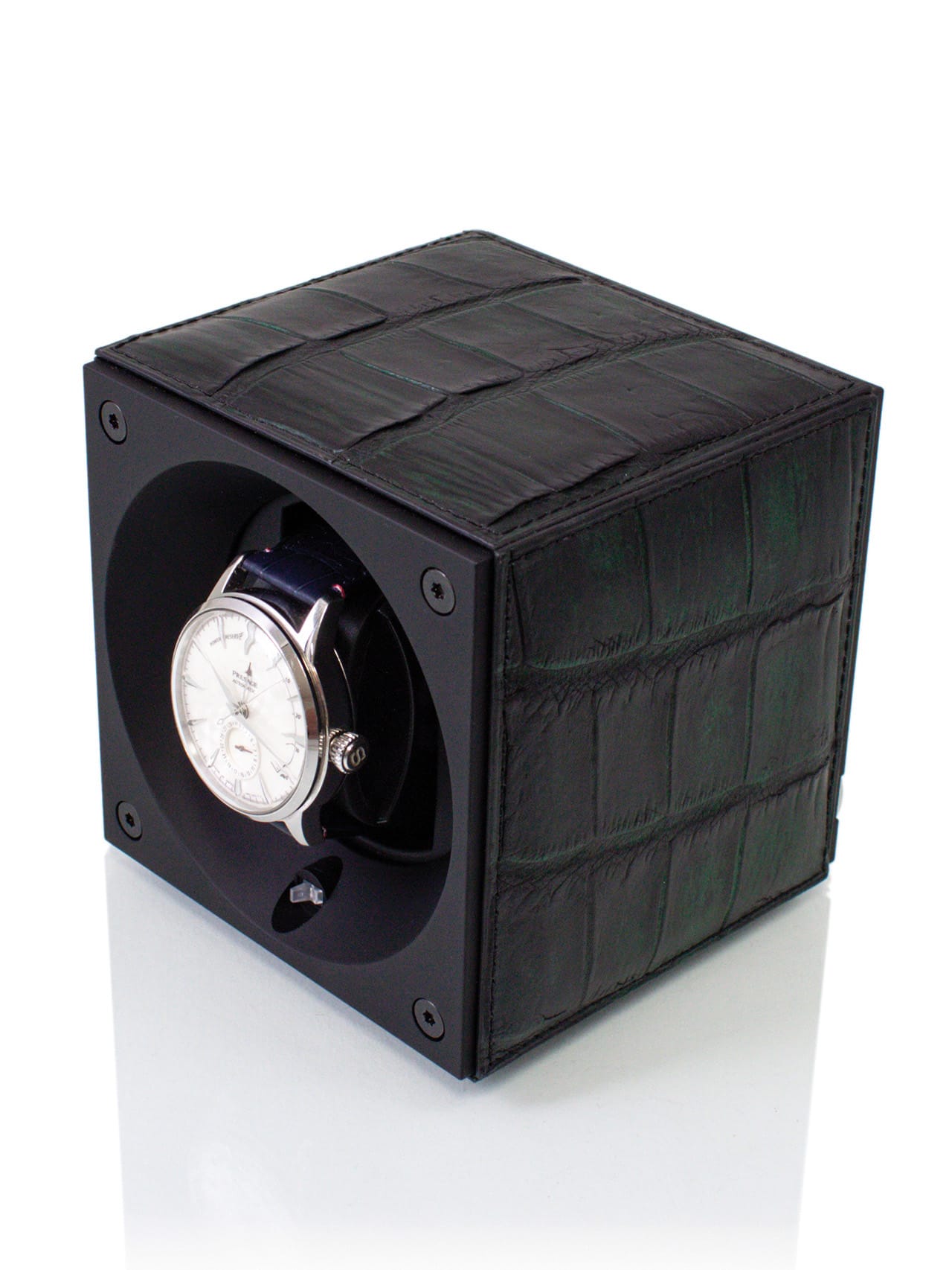 - Exterior details: thanks to its black alcantara base, this leather-covered watch winder will elegantly stand on any piece of furniture.